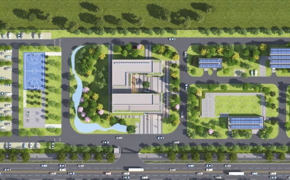 江湾污水处理厂规划建设规模40万吨/天,近期建设规模7.5万吨/天。结合自然基底与环保材料工艺建设出一座可展示、可参与、可循环的低碳厂区兼顾生态服务、科普教育与厂区形象展示“生态展厅,研学基地,低碳讲堂”。通过精确曝气、智慧加药、智慧平台、光伏发电、海绵城市等应用,打造“运行高效、资源回收、能源节约与利用、智慧控制、环境舒适”绿色低碳污水处理厂。