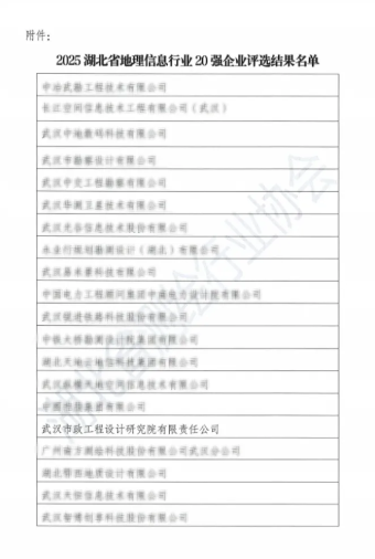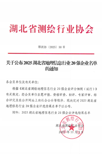 近日,从湖北省测绘行业协会传来喜讯,武汉市政院凭借卓越的技术实力与行业贡献,成功获评“2025湖北省地理信息行业20强”。这一荣誉标志着公司在测绘地理信息领域的专业能力获得省级权威认可,为企业发展里程碑再添浓墨重彩。