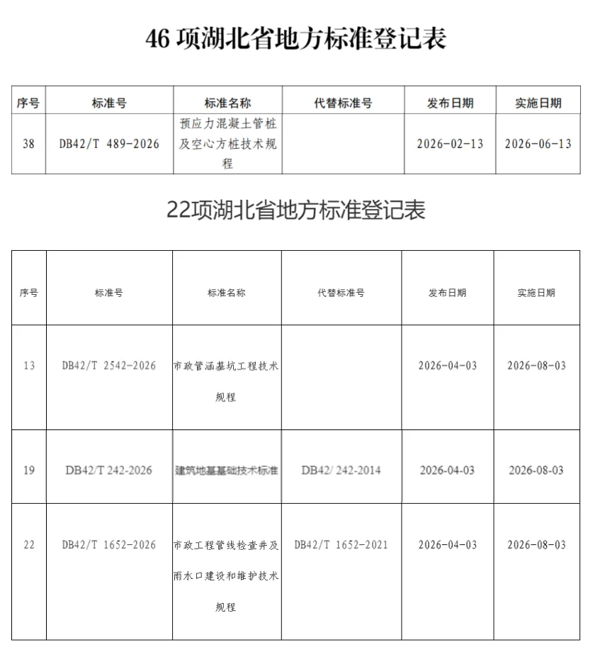 近日,由湖北省市场监督管理局正式批准,公司主编的《市政管涵基坑工程技术规程》(DB42/T 2542-2026)、《市政工程管线检查井及雨水口建设和维护技术规程》(DB42/T 1652-2026),以及参编的《建筑地基基础技术标准》(DB42/T 242-2026)、《预应力混凝土管桩及空心方桩技术规程》(DB42/T 489-2026)正式发布,为湖北省及武汉市工程建设提供权威、科学、先进的技术指导。