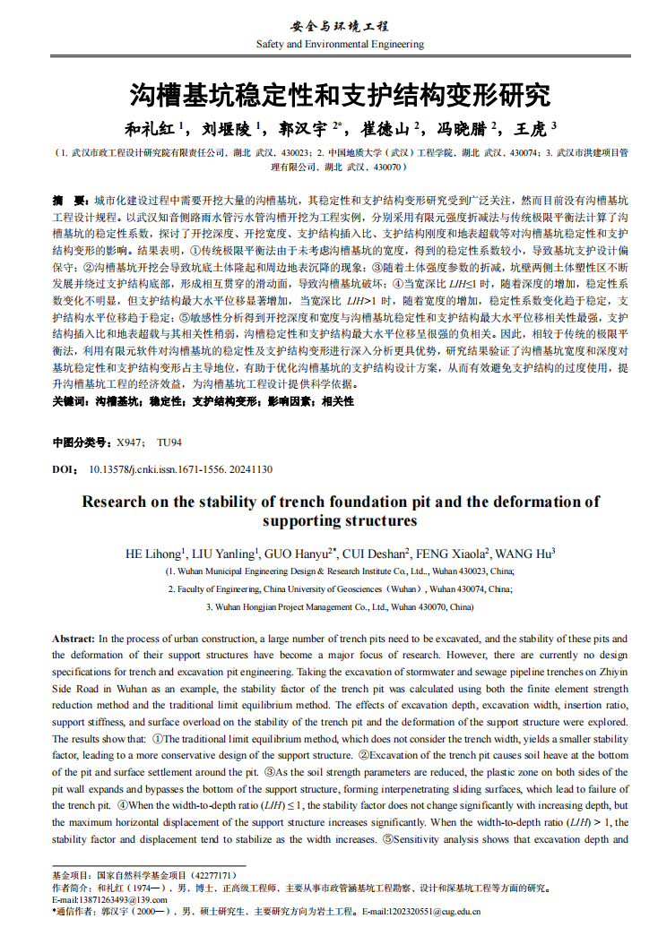 《市政管涵基坑稳定性和支护结构变形研究》被中文核心期刊《安全与环境工程》正式录用。论文围绕市政管涵基坑工程的核心安全问题,通过大量工程实践与理论分析,为基坑稳定性评价与变形控制提供了坚实的理论支撑与计算方法。