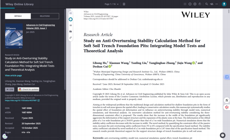 《Study on Anti-Overturning Stability Calculation Method for Soft Soil Trench Foundation Pits: Integrating Model Tests and Theoretical Analysis》成功被 Wiley Online Library 旗下国际权威期刊 Advances in Civil Engineering 收录。论文针对软土地区市政管涵基坑抗倾覆稳定性难题,创新性地融合了室内模型试验分析与典型工程实践经验,提出了更精准的计算方法,研究成果已被 SCI 检索,标志着公司在岩土领域的技术研究水平达到国际前沿。