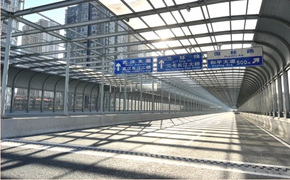 项目设计团队始终秉持 “轻量化、智能化、绿色化” 理念,多项技术应用填补区域空白,树立行业新标杆。在铺装材料与工艺上,主线高架钢箱梁桥面采用浇注式沥青铺装,相比传统方案减重16%,既降低桥梁结构负荷、提升安全性,又缩短施工周期;钢箱梁采用U肋全熔透智能焊接,大幅提高结构疲劳寿命,积极推进钢箱梁U肋焊接工艺的发展。尤为引人注目的是,本项目集中展现了三大创新亮点:它拥有全国最长的连续全封闭声屏障,是湖北省首例“光伏+市政”的融合实践,更在武汉率先实现了声屏障光伏发电的应用,为绿色市政建设树立了新的样板。