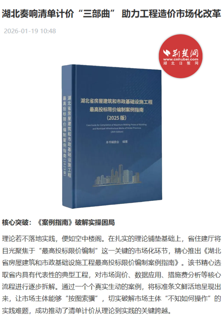 随着《湖北省建设工程工程量清单计价指引(2026)》《湖北省园林绿化工程投资估算指标(试行)》《湖北省房屋建筑和市政基础设施工程最高投标限价编制案例指南》以及《建设工程工程量清单计价(GB/T 50500—2024)及计算标准应用与实务》等一系列规范与专著的陆续发布,湖北省围绕国家标准《建设工程工程量清单计价标准》(GB/T 50500—2024)构建的“理论解析—实操示范—规则指引”三位一体清单计价体系已正式形成,标志着湖北省工程造价行业迈入市场化、规范化发展的新阶段。近日,荆楚网与湖北日报网专题刊登了题为《湖北奏响清单计价“三部曲”助力工程造价市场化改革》的报道。